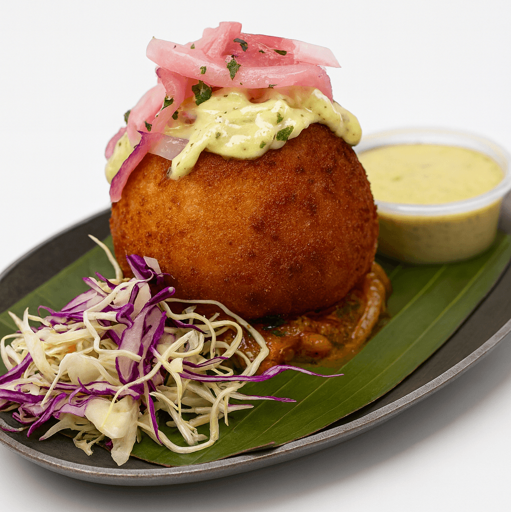 Stuffed potato ball filled with savory beef picadillo, served with ají, cilantro ranch crema, and mojo onions