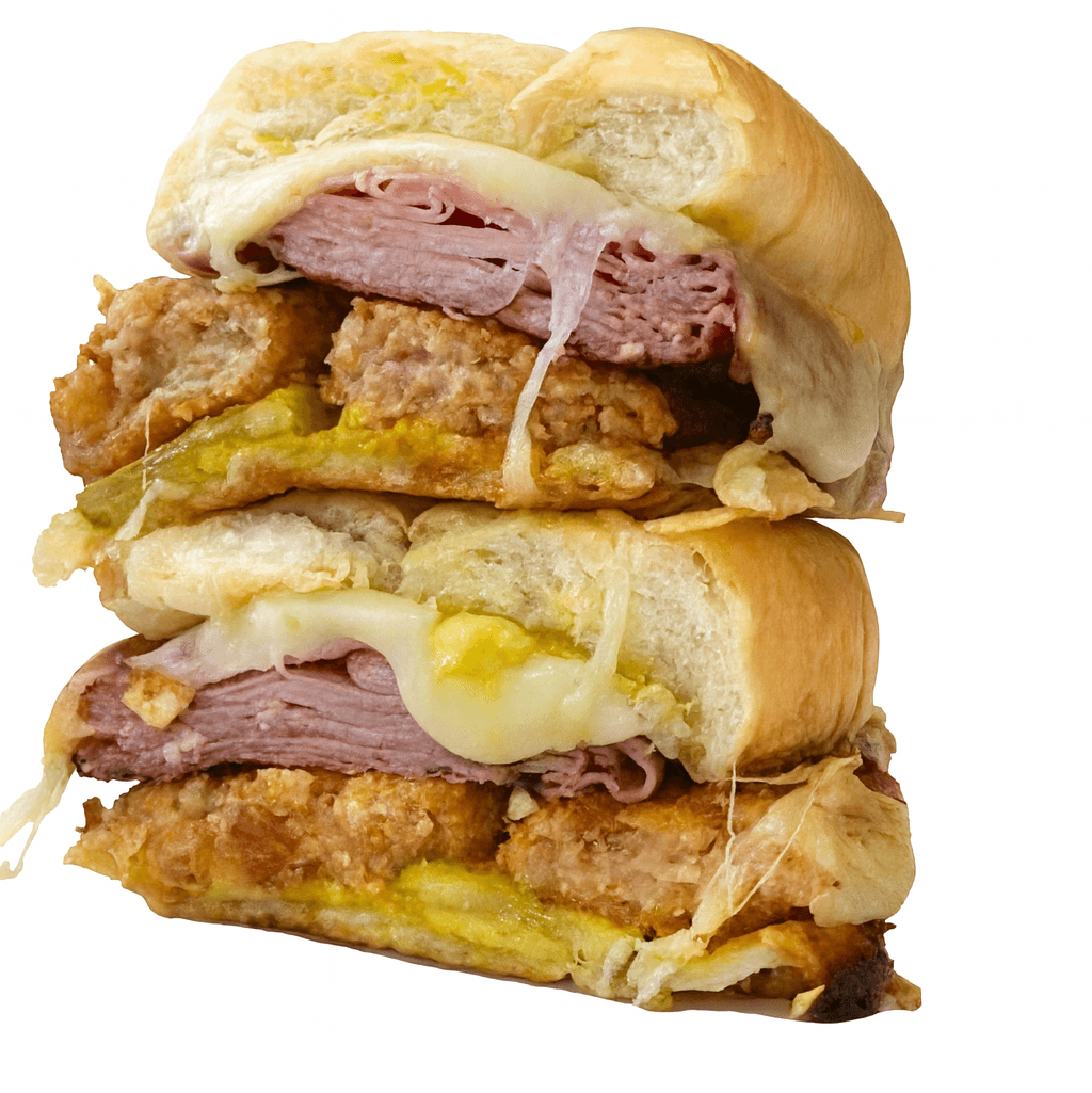 A classic Cuban sandwich layered with ham, Swiss cheese, crispy croquetas, pickles, and mustard, pressed until perfectly golden, served with fries