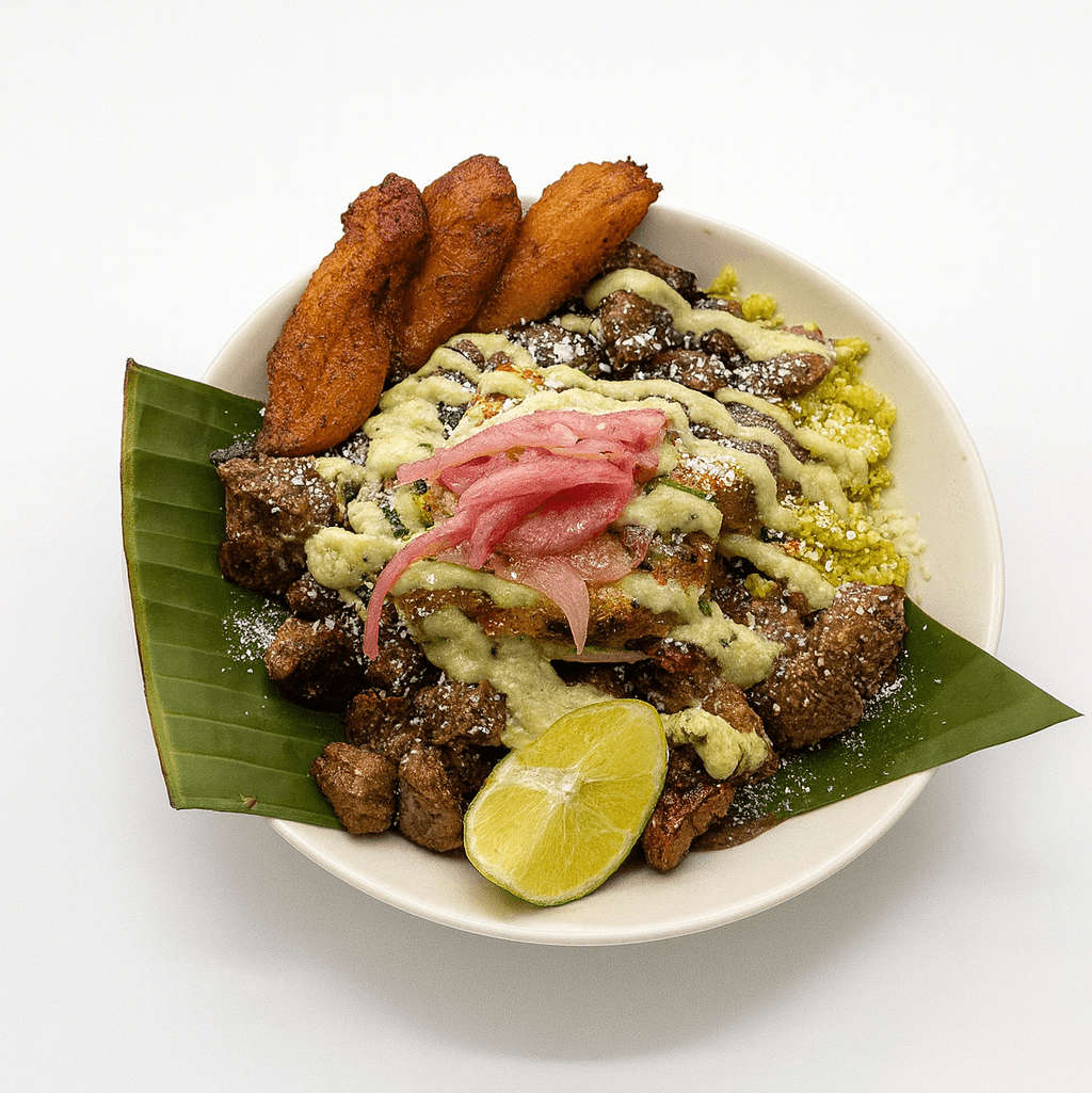 A vibrant Cuban-style bowl featuring cilantro rice or black bean calentado, and sweet plantains, topped with queso fresco, Cuban-spiced ají, guacamole, and a drizzle of cilantro ranch crema. Choose your protein to complete your bowl